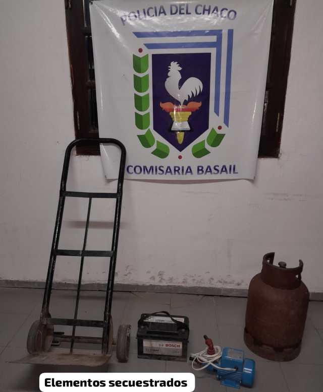 SECUESTRO: (01) batería tipo 12 x 85, marca Bosch de color negro; (01) yegua de arrastre para transporte de carga con dos ruedas, (01) bomba periférica, color celeste, marca FLUVIAL, modelo NERO potencia 0,5HP 200w origen chino, con cable de alimentación de 3 mts aprox. color blanco, (01) tubo de gas de 10 kg color marron