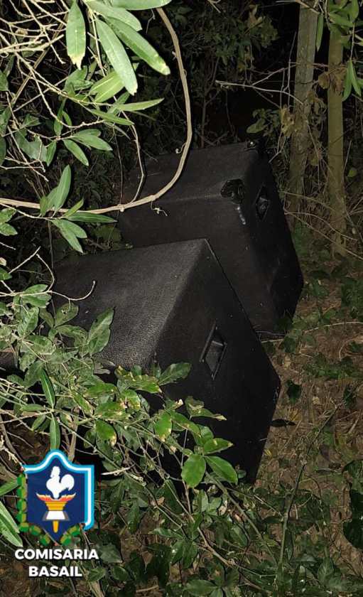 Tras investigaciones del personal Policial abocado a las investigaciones y en materia operativa de Prevención; Personal de la guardia, como así también personal que se encontraban de franco en servicio vistiendo de civil, lograron establecer mediante información brindada por vecinos del lugar que sujetos extraños se encontraban trasladando dos bultos o cajas grandes de color negro por el camino en dirección hacia la Estancia La Aurora, del cual, procedieron a realizar un operativo cerrojo por la zona y rastrillaje de a pie campo adentro logrando visualizar entre pastizales dos parlantes siendo coincidentes con los descriptos por el denunciante.